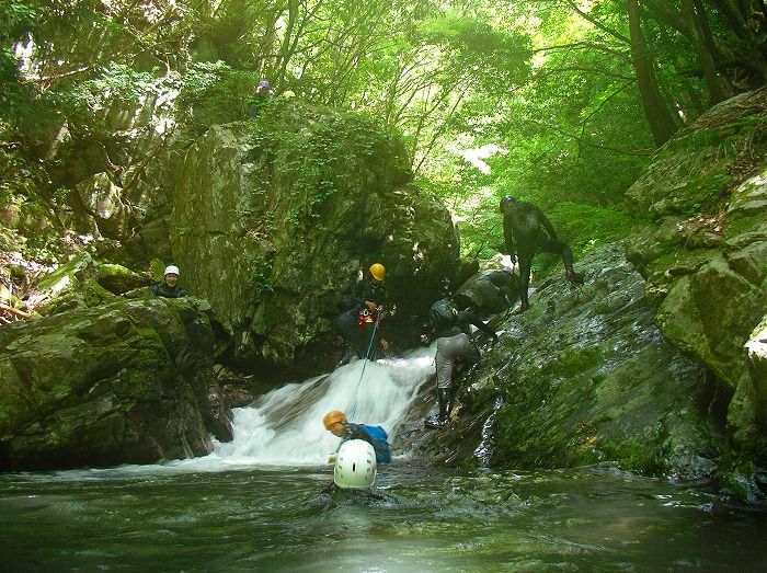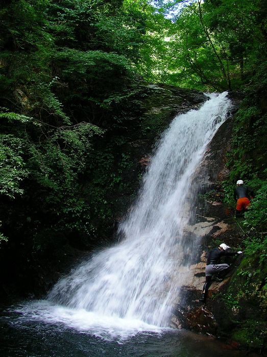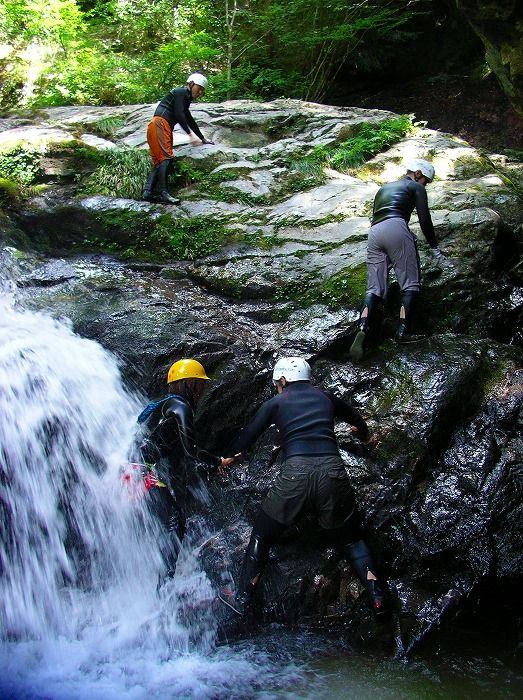 単なる山登りやフリークライミングと違うのは、一つ一つの難所をクリアした後には冷たい水