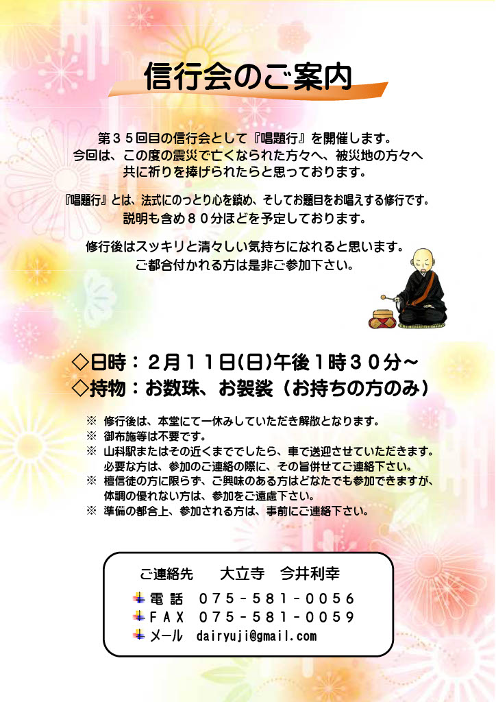 さて、来月2月11日(日)13時30分より第35回信行会として『唱題行』を開催致します。